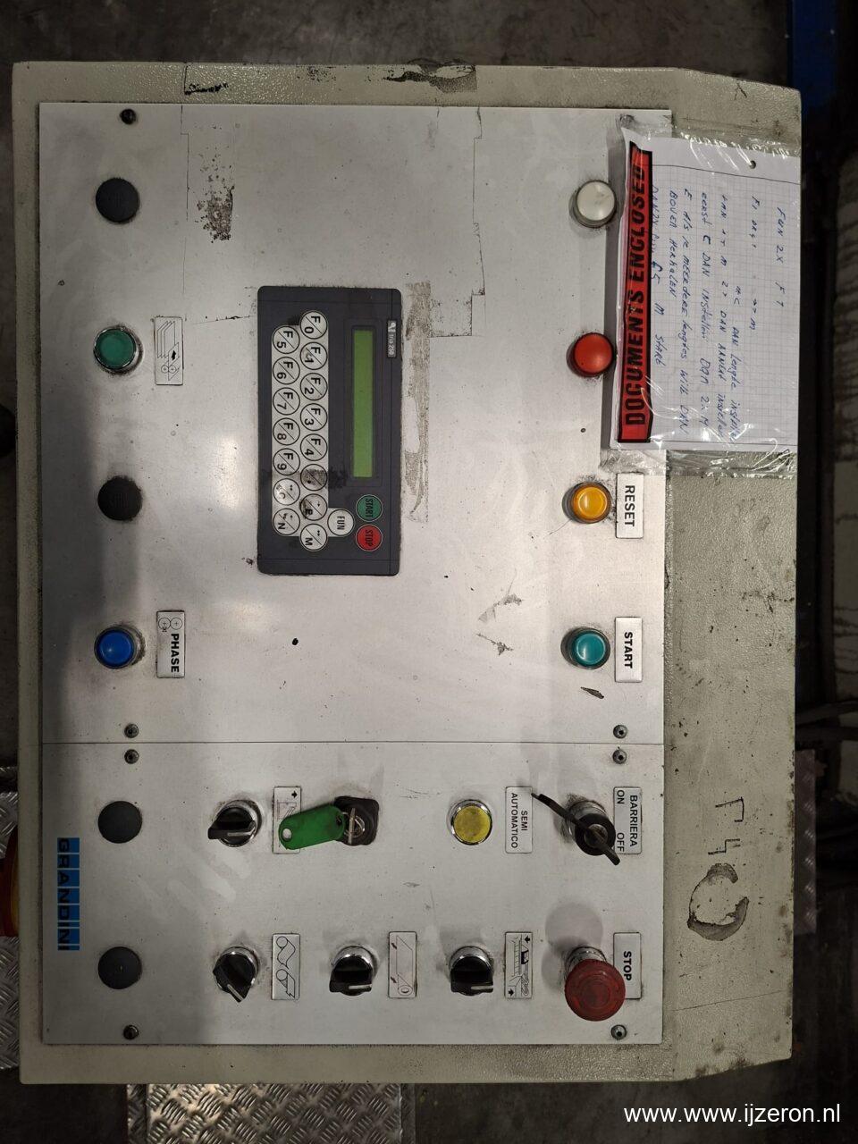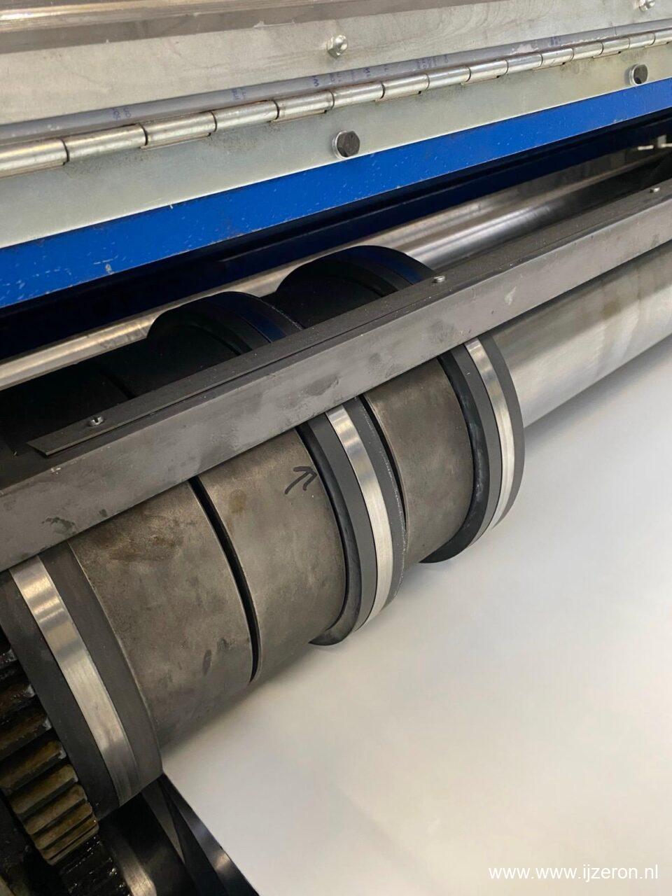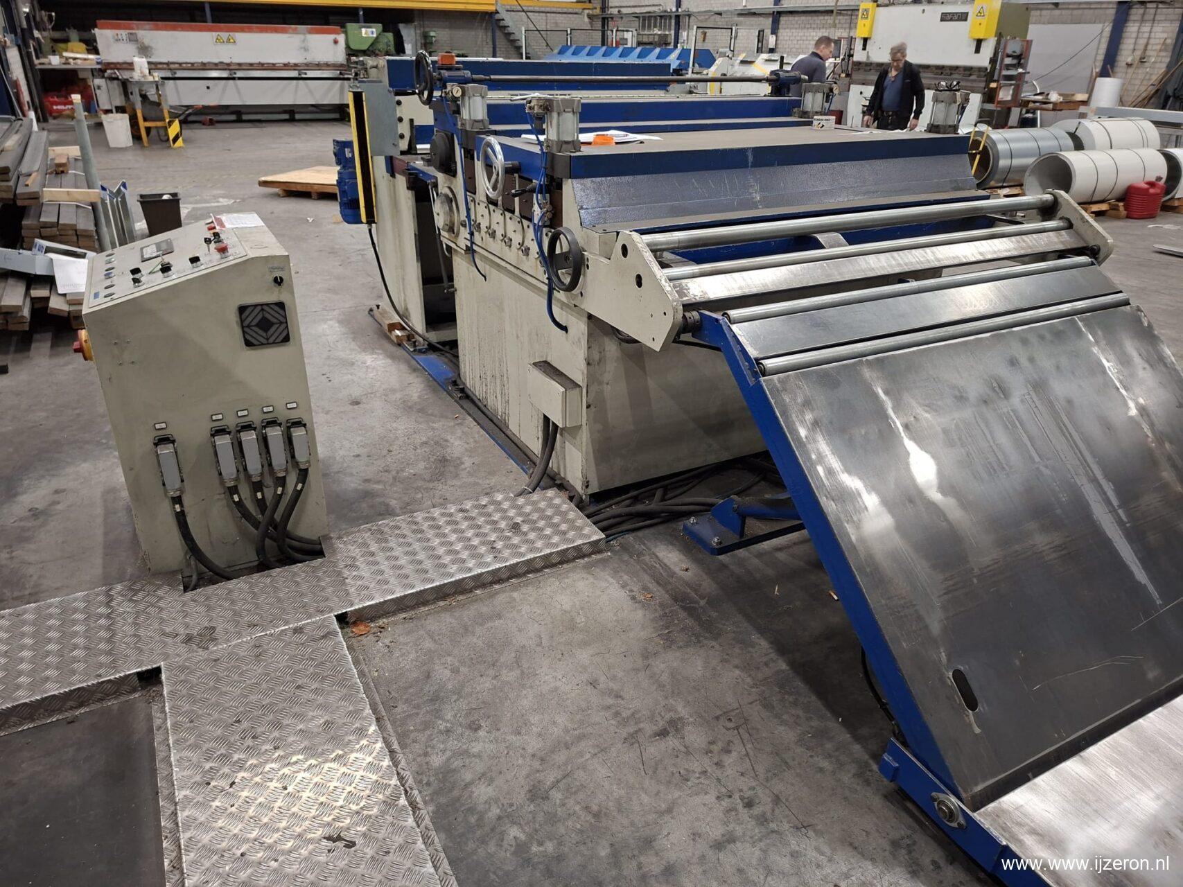 Grandini slitter, Afwikkel haspel 5T, hydraulische tafel 7 voudige richtwals met sleep rol, slitter met 5 messen en afstroop ringen, schaar 1500 x 2,5mm